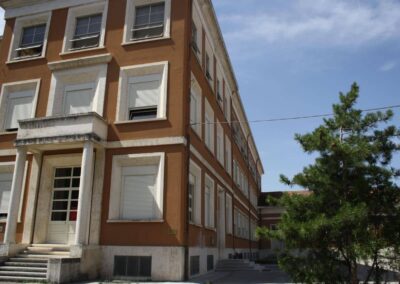 Il complesso scolastico è composto da due corpi: l’edificio principale, di forma a “C”, che si sviluppa su quattro piani, e un edificio secondario adibito a palestra. L’intervento di adeguamento strutturale sull’edificio principale prevede l’inserimento di un sistema di isolamento sismico, che riduce le sollecitazioni sismiche e migliora la risposta dinamica della struttura. Verranno anche eseguiti rinforzi puntuali su alcune travi e pareti in muratura, per garantire una distribuzione più efficiente delle forze sismiche.