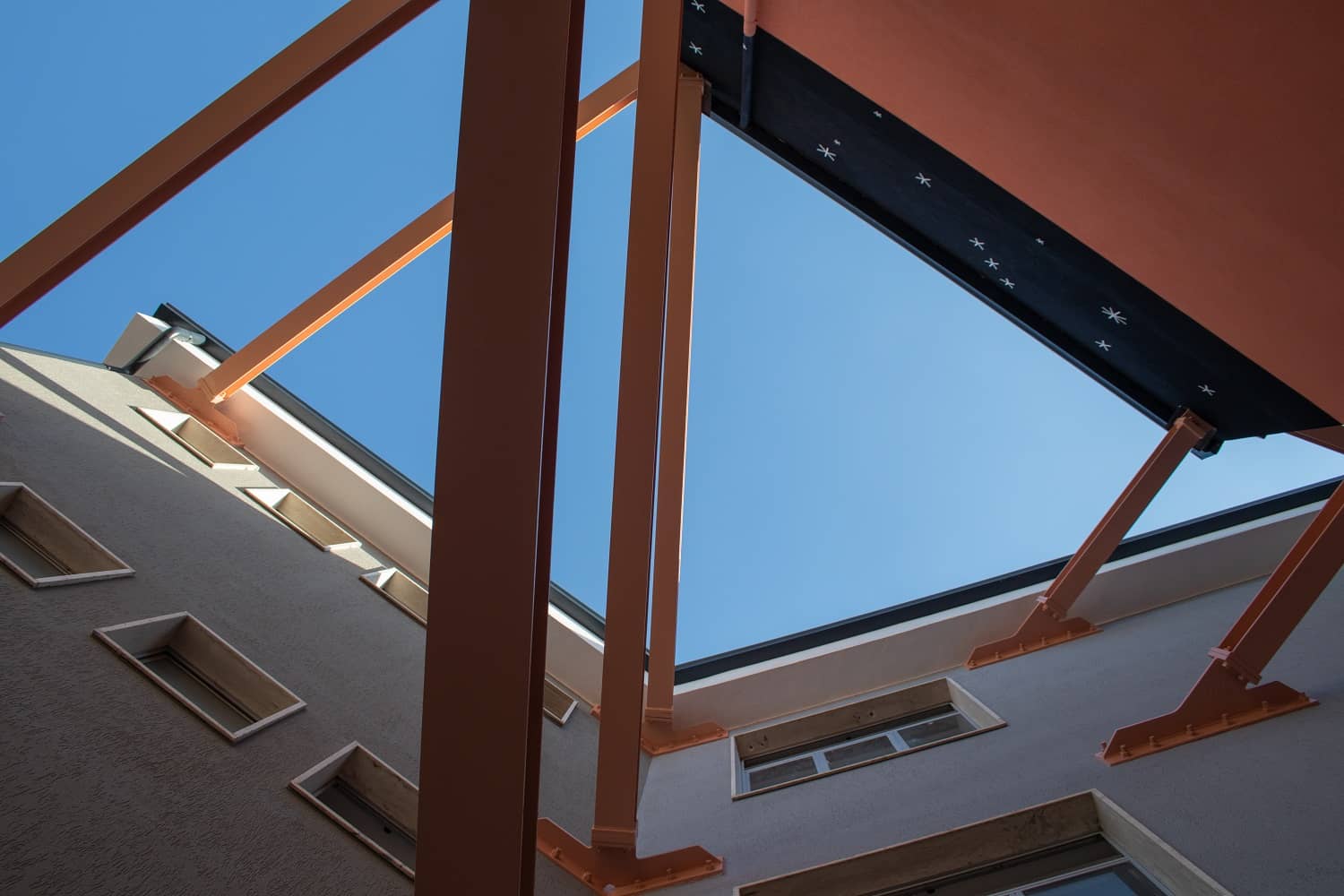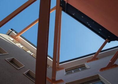 Dopo aver valutato diverse opzioni, si è scelto il sistema delle “Torri Dissipative”, sviluppato da Seitec Seismotechnologies. Questo metodo prevede l’installazione di torri esterne dotate di dispositivi che dissipano l’energia sismica, riducendo le sollecitazioni sugli edifici. Le torri, ancorate alla base su cerniere sferiche e dispositivi di dissipazione perimetrali, sono progettate per contrastare le forze sismiche, garantendo efficienza e protezione.